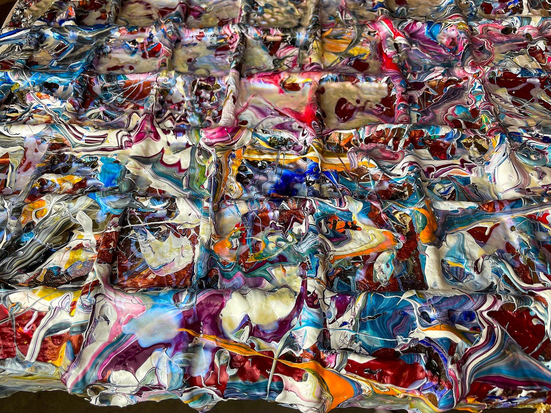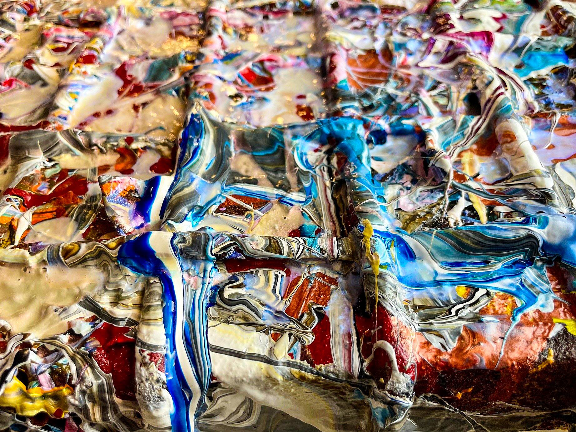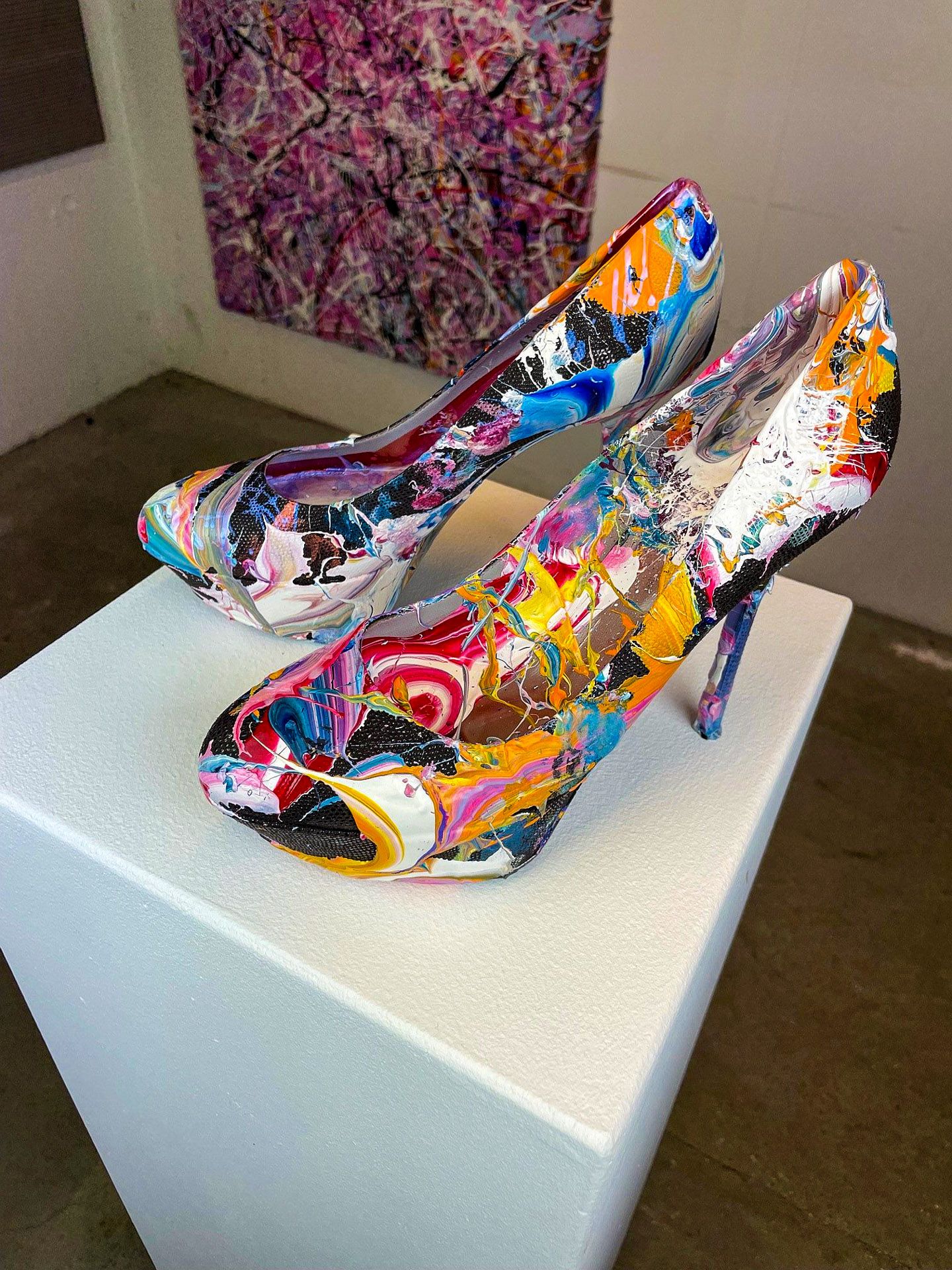 Der dabei erreichte Reichtum und Luxus, findet abschließend seinen Ausdruck im dekadenten Malprozess ausgedrückt zum einen durch überschwängliche Farbverwendung. Insbesondere aber auch das Malen, mit einem Paar Louboutin Highheels versinnbildlicht das Übermaß an erreichtem Wohlstand.