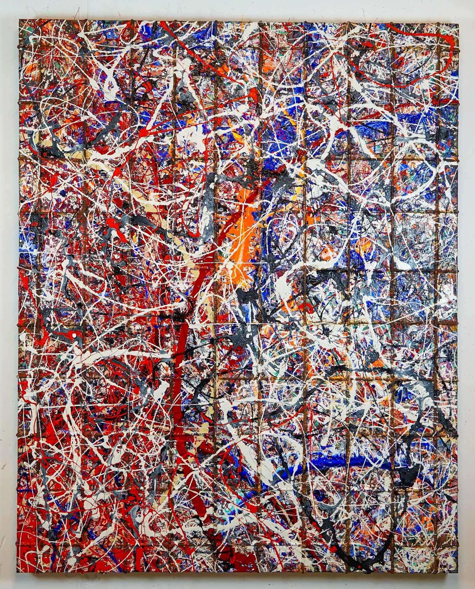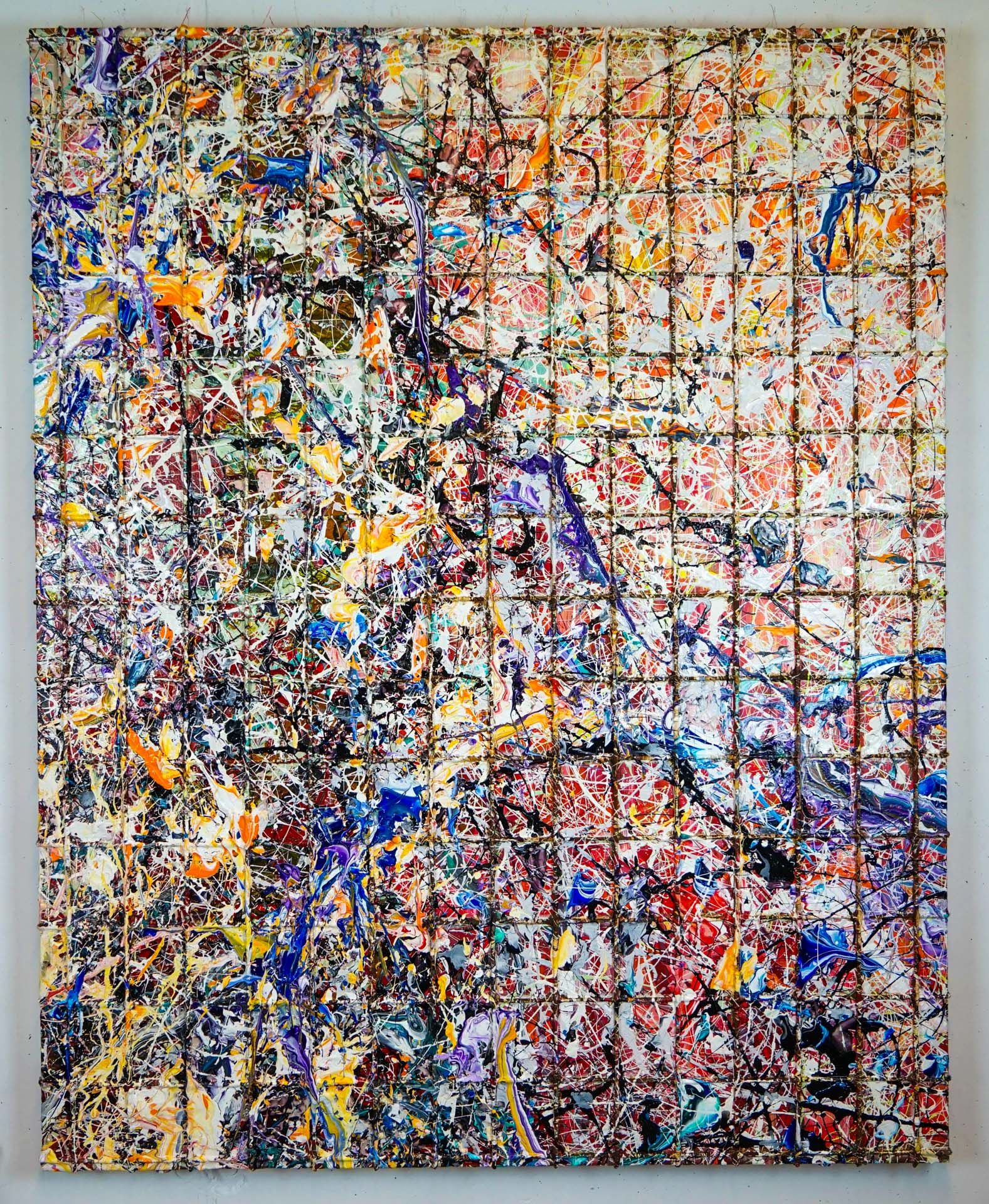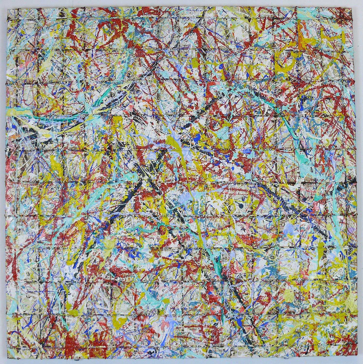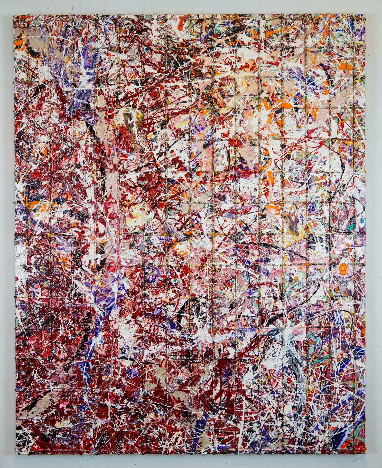This lattice structure transforms into a stylistic device and becomes the basis of a multitude of confused, colorful thoughts and emotions; in the style of Jackson Pollock.