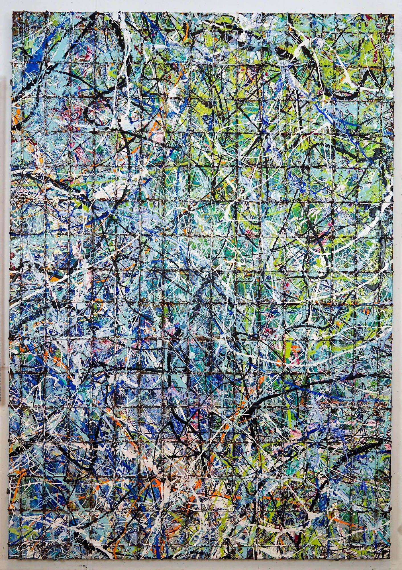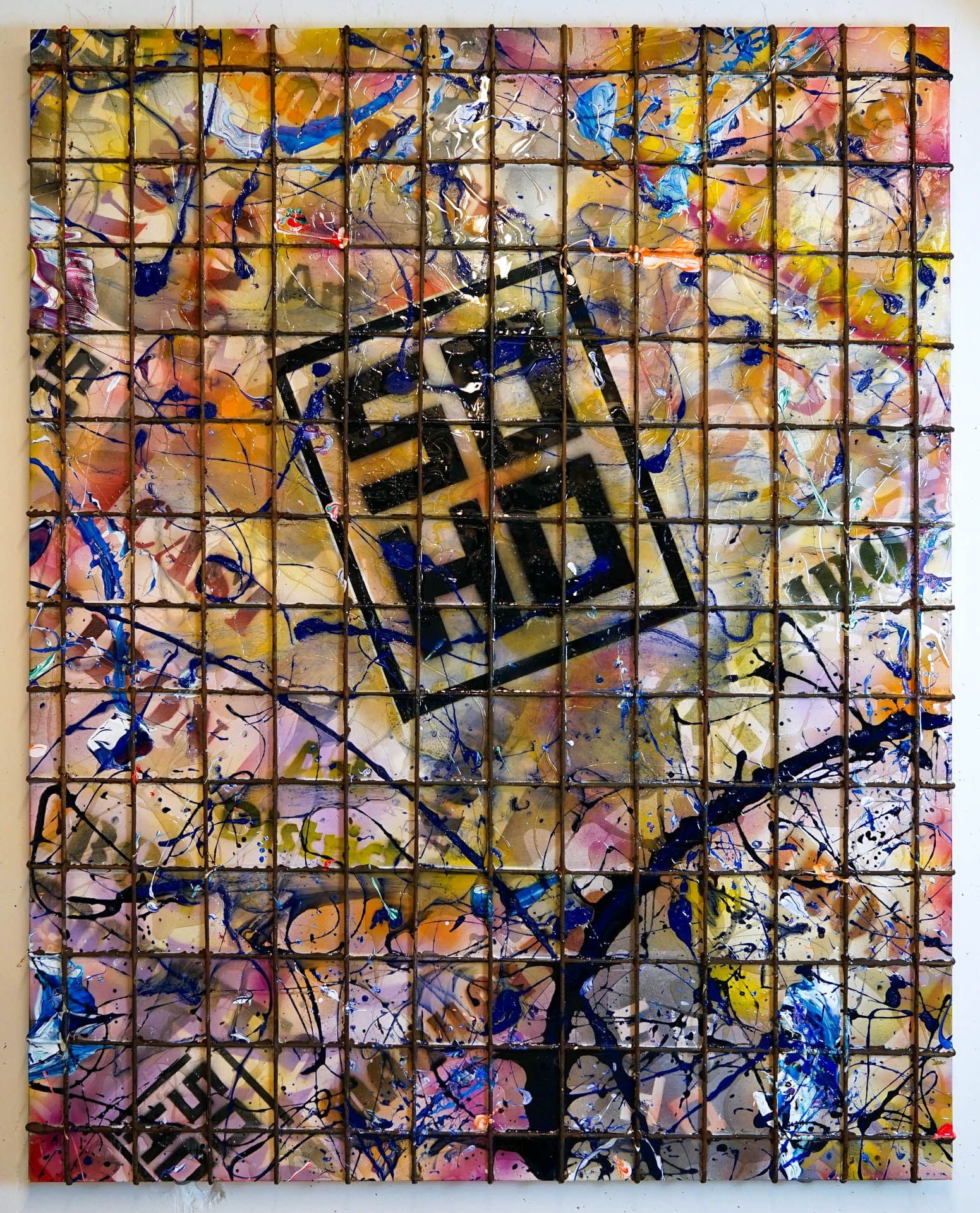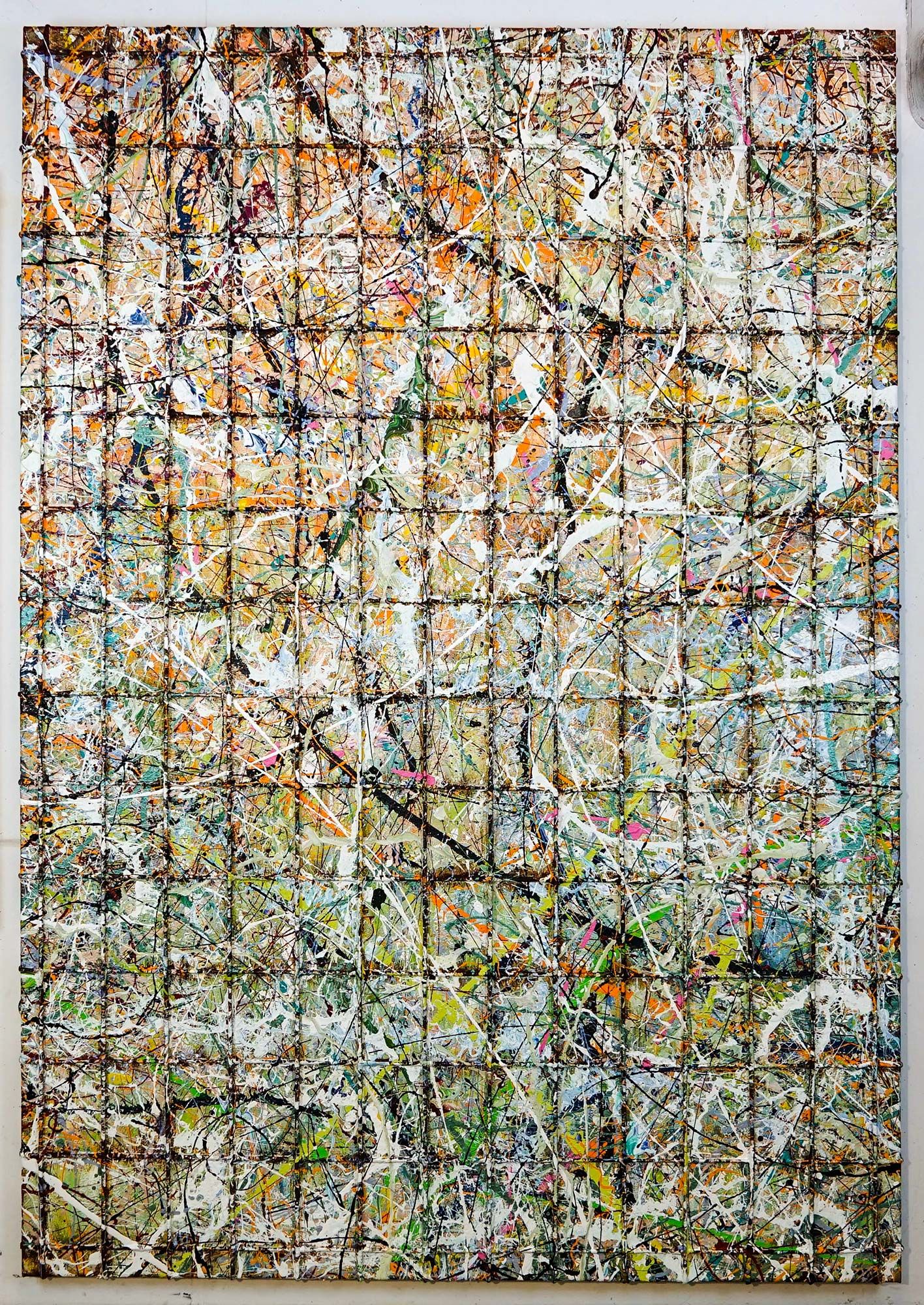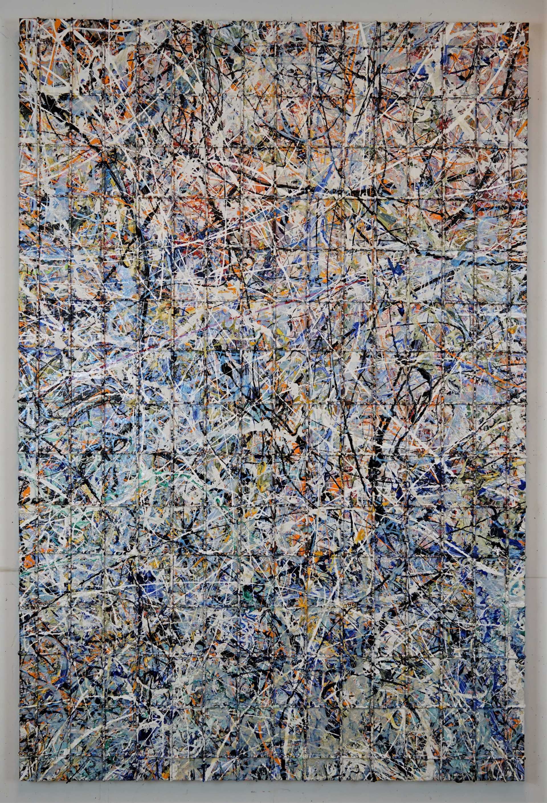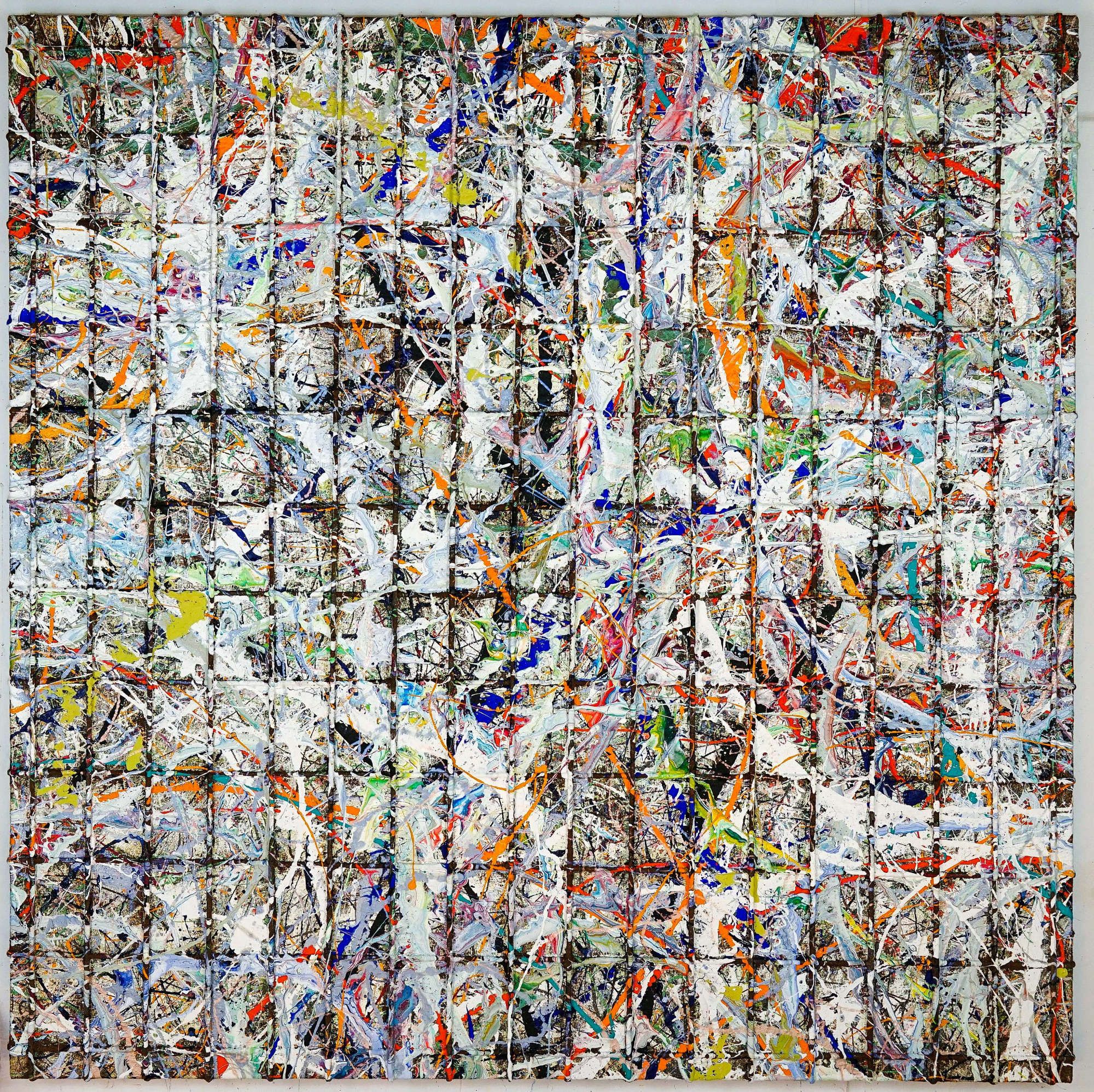 This lattice structure transforms into a stylistic device and becomes the basis of a multitude of confused, colorful thoughts and emotions; in the style of Jackson Pollock.